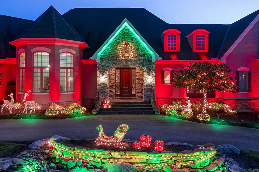 Home decorated with red and green holiday lights, lit wreath, and glowing outdoor Christmas displays.